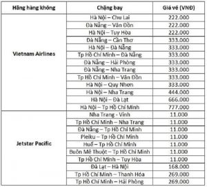 Trong khi đó Jetstar Pacific mở bán từ 11.000đ/chặng khởi hành từ ngày 01/12/2020. Bạn có thể tham khảo các hành trình và mức giá được hai hãng hàng không áp dụng dưới đây:
